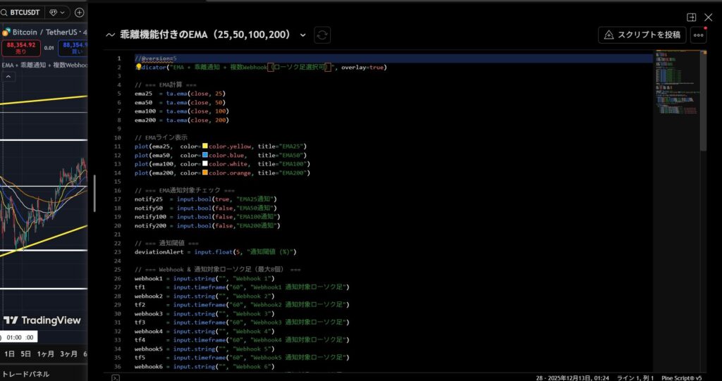 pineエディターでは、自作のインジケーターを作成しチャートに反映させることが可能!最後まで見てくれた方に指数平滑移動平均線から何%現在価格が離れているのかを表示してくれるものを置いておきます。チャートのメニューからpineを選択し、以下のコードを貼り付ければOK