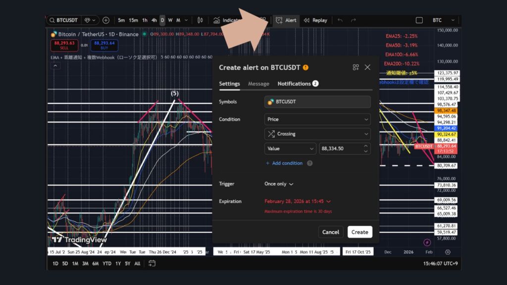 価格アラートを設定すればかなりの数作れるので、ずっとチャートを監視しておく必要なし!メッセージの部分から通知メッセージを変更することが可能